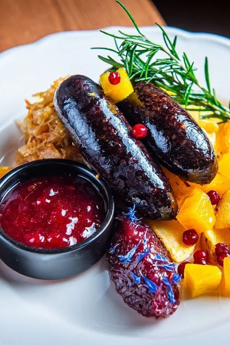 Blood sausages with sauerkraut, country potatoes and lingonberry jam