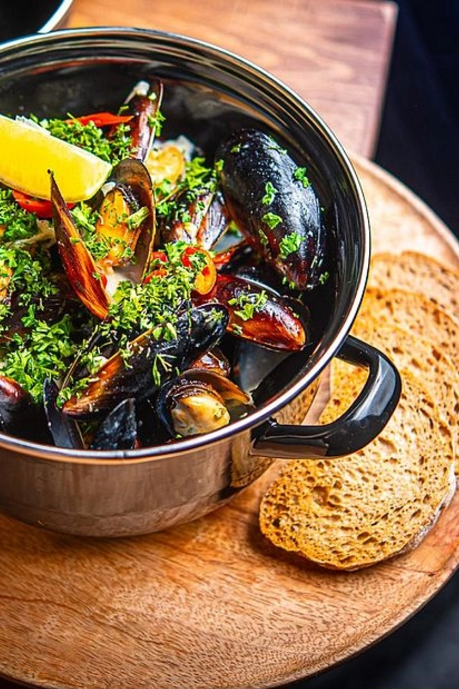 Mussels in a sauce of white wine, garlic, chilli and cream